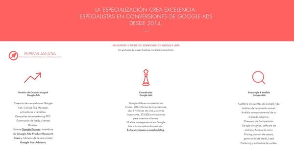 message infoseg about this ad En Biriwuanga somos expertos en Marketing Digital y Google Ads para Andorra y Espaa. Agencia digital de especialistas en conversiones a travs de Google Ads. Trazamos su estrategia digital de negocio personalizada. Creacin campaas de pago PPC en Google Ads. Google Tag Manager, Activadores y Variables. Campaas PPC Remarketing. Lead Generation & Ventas directas. Anlisis situacin actual. Anlisis comportamental de tu pblico. Check up competencia. Google Analytics, Software anlisis & Heatmaps. Contctanos! Telfono: 00376651661 (Andorra) eMail: info@biriwuanga.com httpsbiriwuanga.com |
