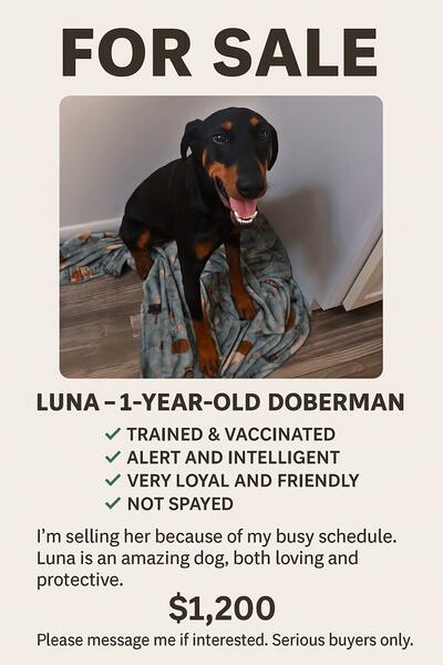 message tebaali about this ad Meet Luna a stunning, 1-year-old purebred Doberman Pinscher looking for her forever home Shes: Fully vaccinated House-trained Extremely intelligent & alert Very loyal, sweet, and protective Raised indoors clean and social Not spayed Luna is the full package perfect as a family companion or personal protection dog. Only selling due to my busy work schedule she deserves more time and attention. Comes with leash, collar, and her favorite blanket. Located in Phoenix, AZ will not ship. $1200 firm serious buyers only. Message me now before shes gone! |