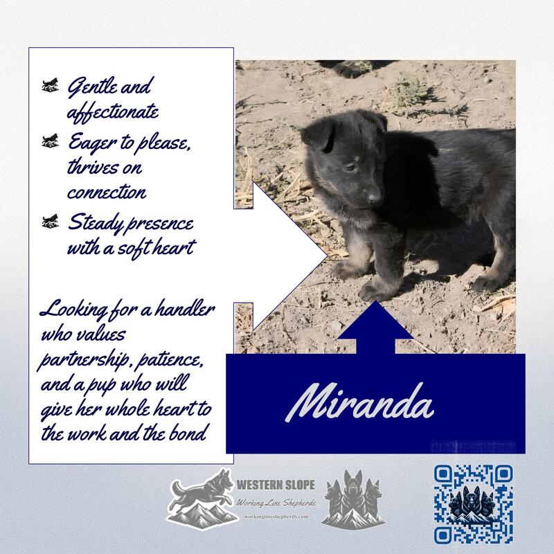 message wswls about this ad Available Tuesday, December 2 Temperament proof available via video $500 deposit is required to hold Full payment due before pickup Fully dewormed and 5-way vaccinated Vet check & microchip scheduled after deposit (per health guarantee) Located in Delta, CO Placement by contract only Miranda doesnt bluff. Named after Miranda Lambert, shes bold, observant, and ready to work. Food-driven, handler-focused, and quick to read the roomshes got the grit to go all day and the clarity to know when to hold back. AKC-registered working-line German Shepherd pup Out of Abel ze Sonorske Oazy Kimber (Xarma de Ola-Zar) Pedigree Highlights Abels grandsire, Jakub Sov mln: 6th at Czech IGP3 Nationals FCI World Championship alternate Kimbers maternal granddam, Karo z Udoli Upy (IPO3/SchH3/ZVV3 2020 IGP Czech National winner 2021 WUSV World Championship competitor |