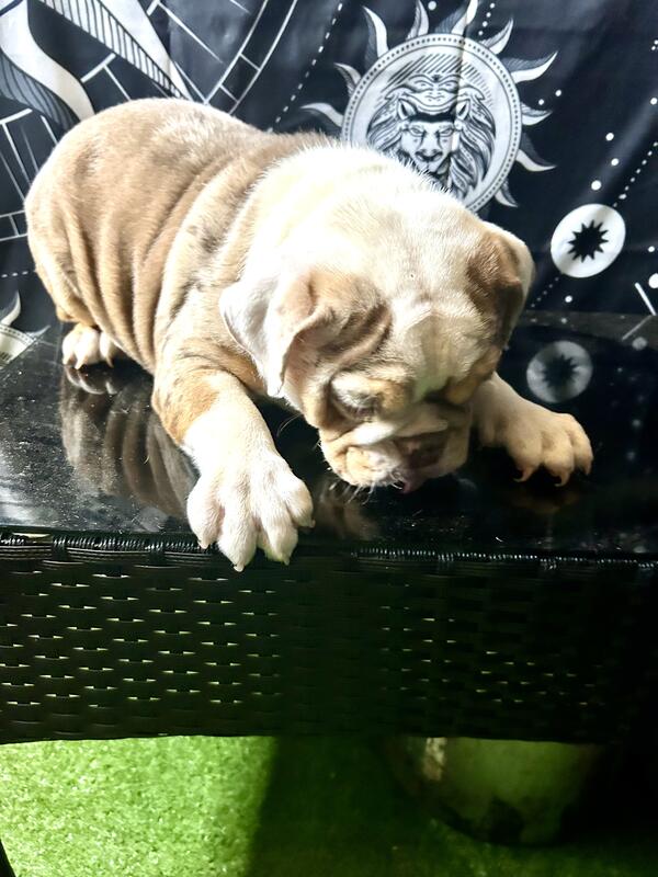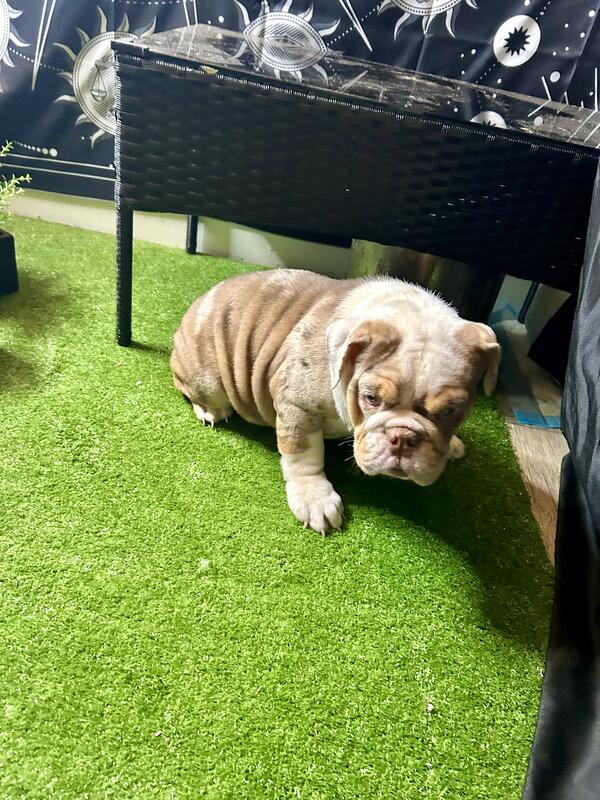 message pmil about this ad Meet BabyBob! Shes a chocolate tri Merle EnglishBullDog ready for rehoming! Shes 17wk (4months) house and crate trained, upd on shots, been dewormed and Akc registered! She has champion all throughout her line. She was my keeper! Rehoming fee $2200. Contact 4zero4nine6zero0zero1four if interested |
