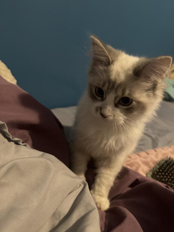 message hanjibear about this ad His name is Oso he is 5 months old was born in August 2nd 2025. He is a Ragdoll kitten. My friend is pregnant and makes it hard to keep up with him since he is really playful. She had rescued him from a bad situation when he was 8 weeks(he was covered in fleas and has had a foot injury) he has his kitten shots but thats about it with shots. He is good with dogs. He is friendly and really playful he plays with whatever he finds. |