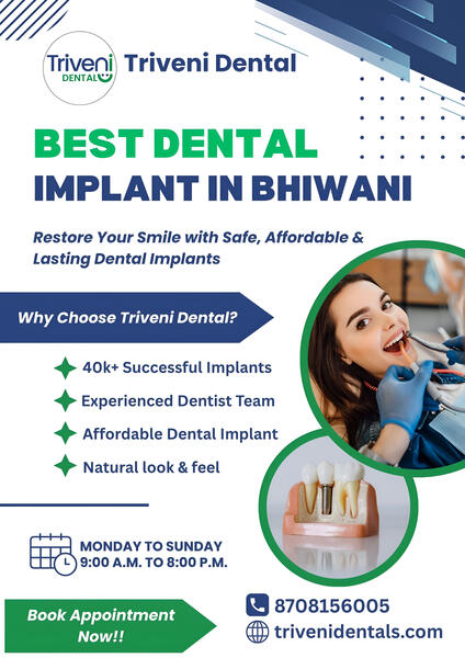 message trivenidental about this ad Looking for the best dental implant in Bhiwani? Choose Triveni Dental and get treated by the best dental implant doctors in Bhiwani at affordable cost with advanced technology. Trusted as the best dentist in Bhiwani for implants Natural-looking, long-lasting results Affordable pricing starting from 20,000 Book your appointment now |