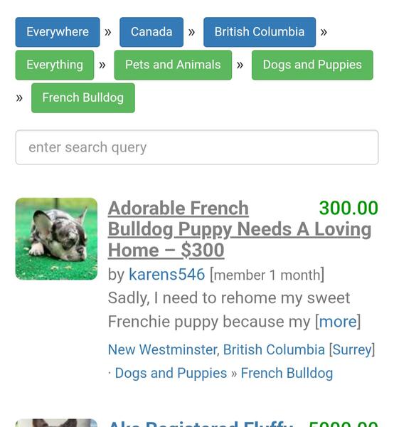 message anj29 about this ad He is using a name Karen Laughlin with his phone # 5407518589. His ads is about rehoming french bull dog for 300 dollars and said its not about the money but a good home for his pup. He stole and used pictures from online of french bulldog for his ads. His ads is still up so PLEASE DO NOT FALL for it! He asked me to etrans 150 dollars to reserved the pup even without me seeing the actual pup nor himself, which is very SUSPICIOUS. YOU CAN CHECK HIS OTHER LISTING TOO |