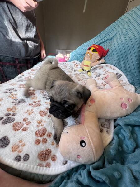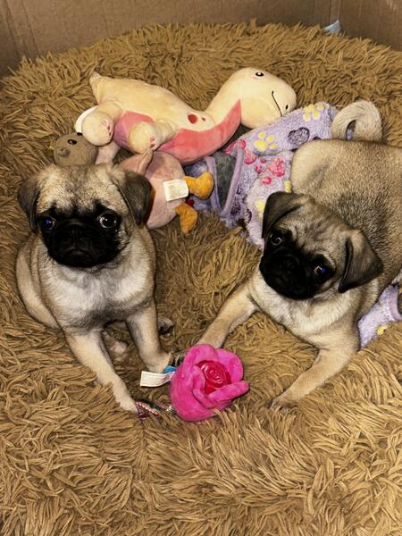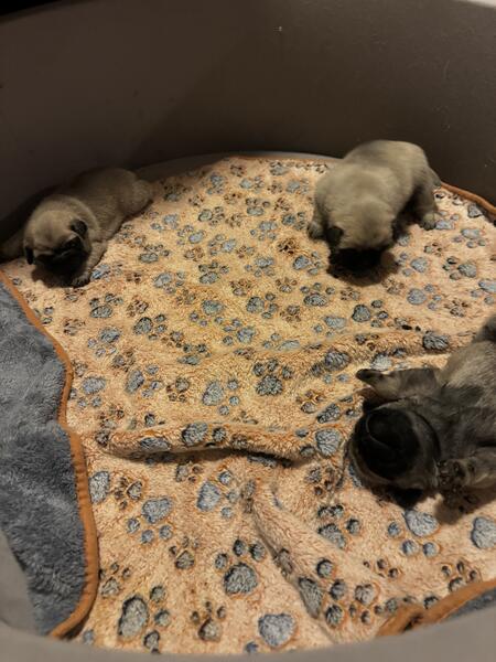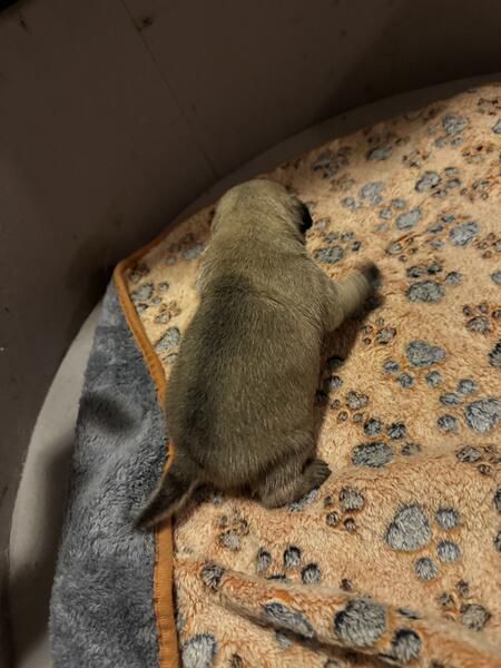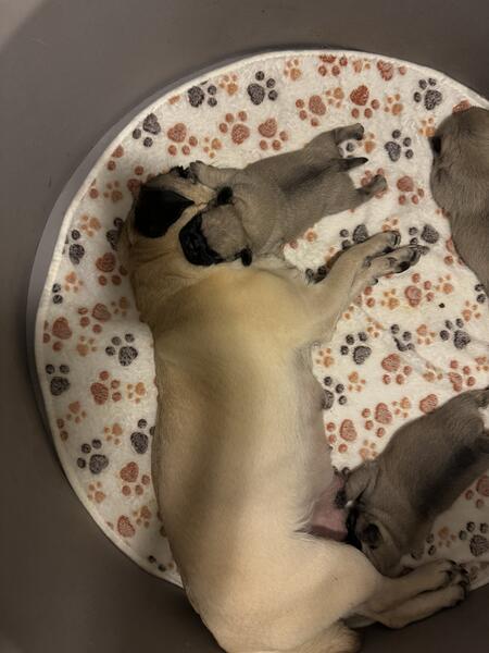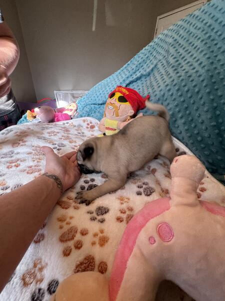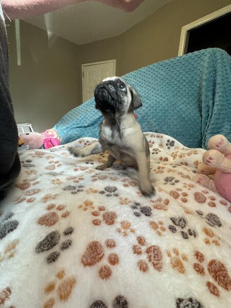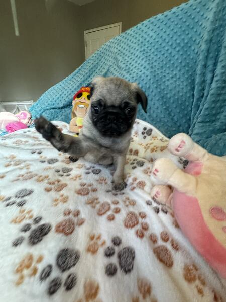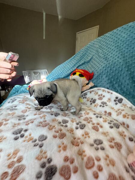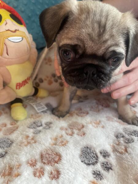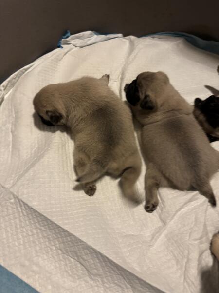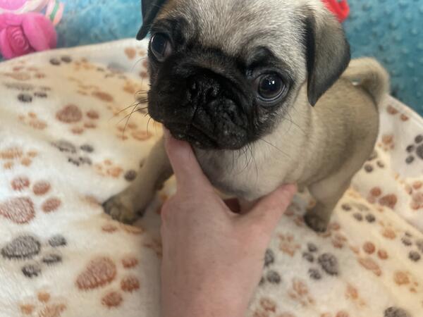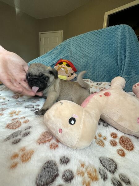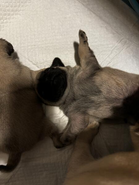 message whitneyspugs about this ad Bear is a fawn pug puppy. He was born June 18th. He is vaccinated, puppy pad trained, and eats only dry food. He comes with a blanket that smells like Mom and a small bag of food he is used to eating. |