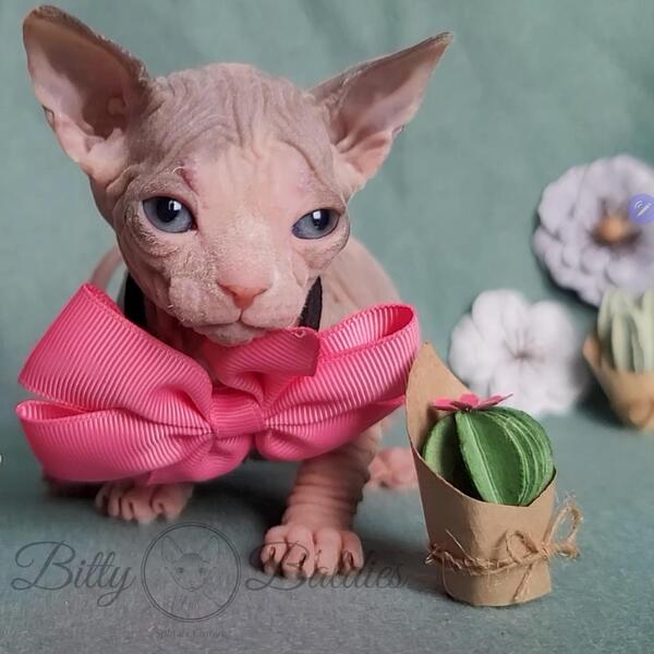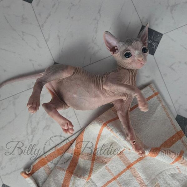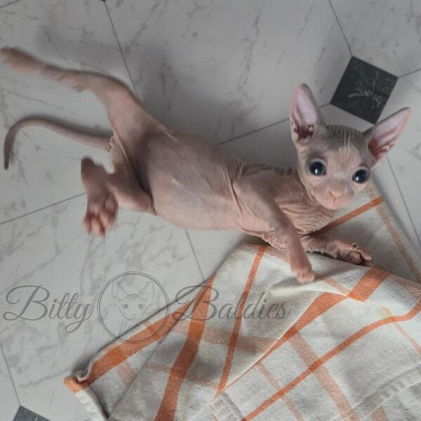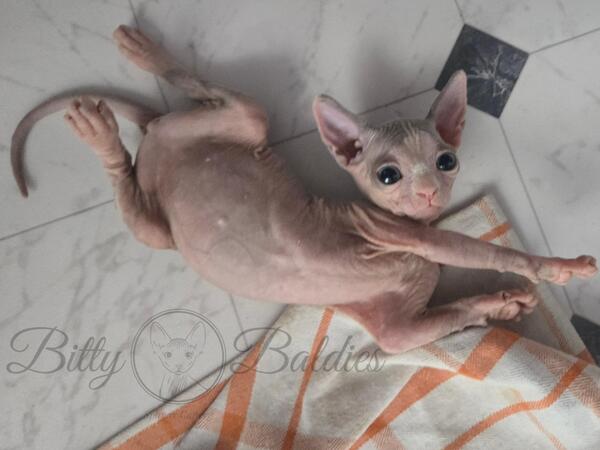 message bittybaldies about this ad This is Gabby she is a blue and white bicolor sphynx girl with blue eyes she loves cuddles and being the center of attention . She is fully potty trained as well as totally spoiled She will come with a 2 year HCM guarantee as well as health guarantee, TICA registered, spayed, with age appropriate shots, and dewormed. We are a yearly HCM scanning cattery as well as felv/fiv negative. |