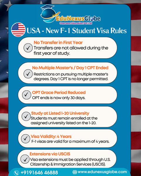 message edunexusglobe about this ad Planning to study in the United States? Staying updated with the latest visa regulations is crucial for a smooth academic journey. EduNexus Globe, a British Council Certified and ISO 9001:2015 Certified Overseas Education Consultancy, is here to simplify these changes for you and guide you through every step of the process. The United States has recently introduced several updates to the F-1 Student Visa rules. These changes affect new and current international students and are designed to bring more clarity and structure to the visa process. Heres what you need to know: 1. No Transfer in the First Year Students holding an F-1 visa are no longer allowed to transfer to another institution during their first academic year. This rule ensures that students complete at least one year at the institution they initially enrolled in, so planning ahead and choosing the right university becomes more important than ever. 2. No Multiple Masters / Day 1 CPT Ended The option of pursuing multiple masters degrees in succession has been restricted, and Day 1 CPT (Curricular Practical Training from the very first day) is no longer permitted. This change is aimed at ensuring that students maintain full-time academic focus before entering practical training. 3. OPT Grace Period Reduced Optional Practical Training (OPT) now comes with a shorter grace period. Students have only 30 days after OPT ends to depart the U.S. or make other arrangements, compared to the longer duration previously allowed. 4. Study at the Listed I-20 University Students must remain enrolled at the university listed on their I-20 form. Changing schools or transferring will require following the proper SEVIS process and waiting until after the first year. 5. Visa Validity: 4 Years F-1 visas are now valid for a maximum period of four years. Students must plan their programs accordingly and ensure compliance with their visa duration. 6. Extensions via USCIS Any request for an extension of stay must be submitted through USCIS (U.S. Citizenship and Immigration Services) with valid academic or program-related reasons. Timely submission of extension applications is crucial to maintain lawful status. At EduNexus Globe, we go beyond simply informing you of these changes we guide you through choosing the right university, preparing your visa documents, and staying compliant with immigration rules. Our team of experts ensures a smooth and stress-free process, helping you focus on your studies and career goals. Choosing EduNexus Globe means having a trusted partner who helps you navigate every step of your U.S. education journey. With our professional guidance, you can avoid common pitfalls, stay ahead of deadlines, and make the most of your time in the United States. Location: Hyderabad, Telangana Phone: +91-9966111337 Website: httpwww.edunexusglobe.com Email: info@edunexusglobe.com forusa reviews forcanada reviews #ukstudyconsultancyinhyderabad message edunexusglobe about this ad |