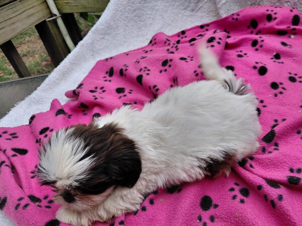 message jeaniew about this ad Our sweet Lacy had five beautiful purebred shih tzu puppies, 2 boys, 3 girls. Will have papers and be up to date on vaccines when they find their new home. Should weigh around 8# grown ready now for their forever loving home. |