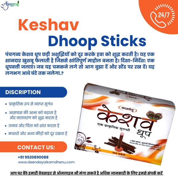 message deendayalkamdhenu about this ad Panchgavya Keshav Dhoop Safer alternative to chemical air fresheners Made from high quality ingredients Natural taste Gomay Dhoopbatti Sticks with a pleasant aroma,Try now For more info contact |