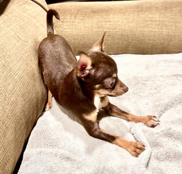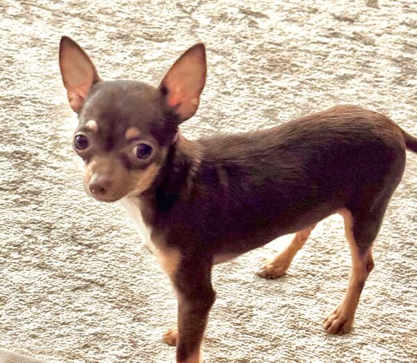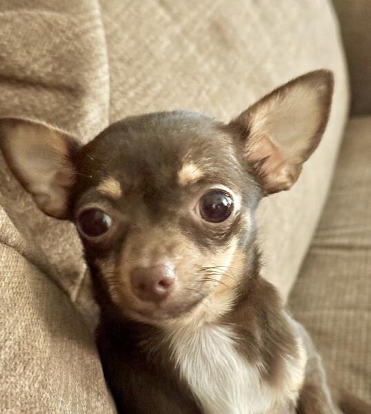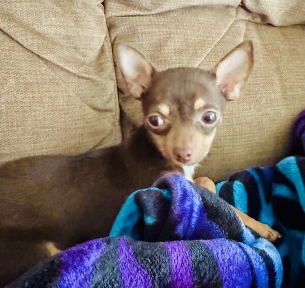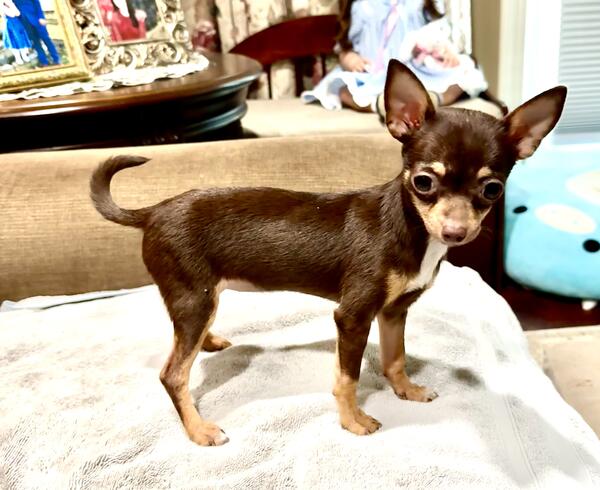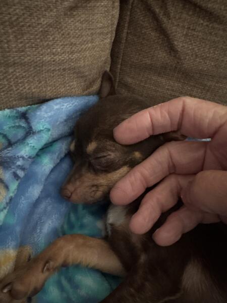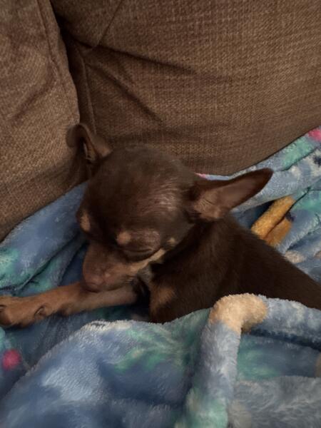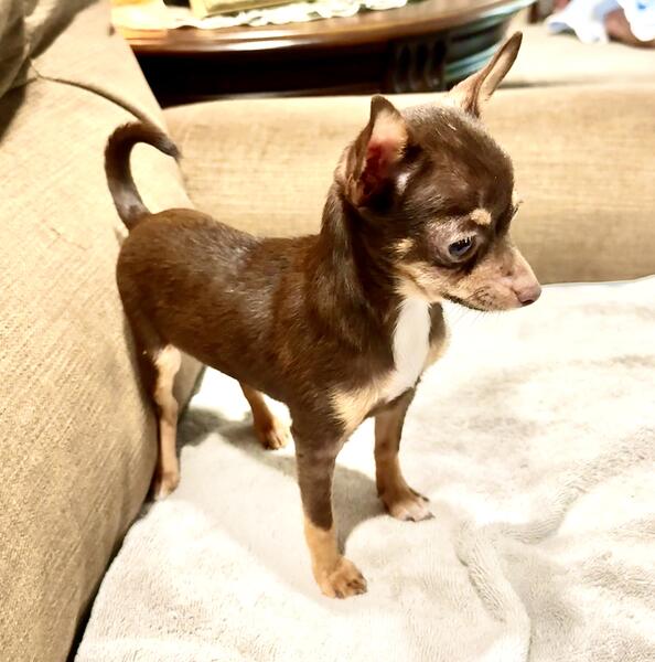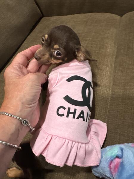 message jennyt72 about this ad We have a 6 month old tiny chocolate female chihuahua that is super sweet super loving and going to be super tiny! She is only 2lbs 2 oz currently and chihuahuas reach their adult eight at 8-12 months old so shes not getting much bigger! She is very clingy and needs constant attention this is your epitome of a pocketbook puppy! She is puppy pad trained, will not go in a kennel very well she is constantly with me and thats why Im looking for her the perfect mom! I have my number one side kick and now shes depressed and feels I have replaced her so I feel this needs to be your only dog one to spoil and go everywhere with you, sleep with you, wear little fancy clothes! So if you ever wanted one of those expensive pocket chihuahuas heres your chance without paying thousands! You can see how tiny she is with my hand on her face and I had to include the photo when she covered her eyes as if please stop Im trying to sleep lol message jennyt72 about this ad |