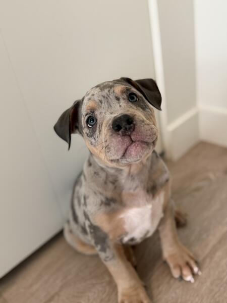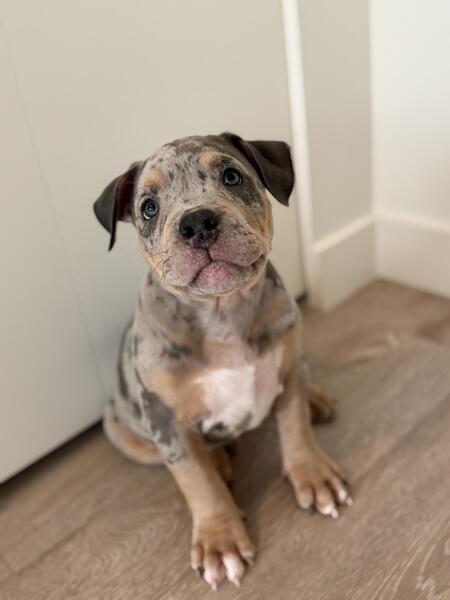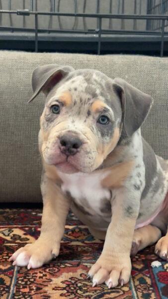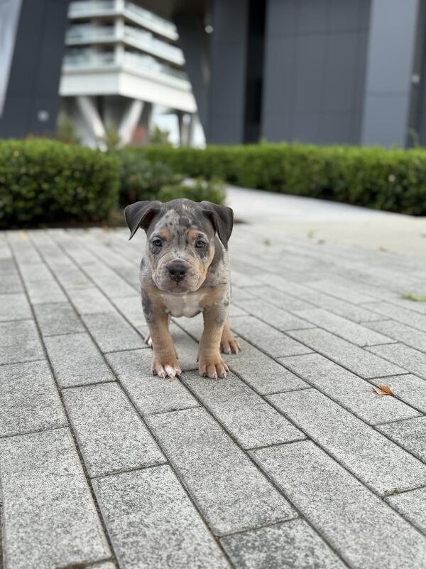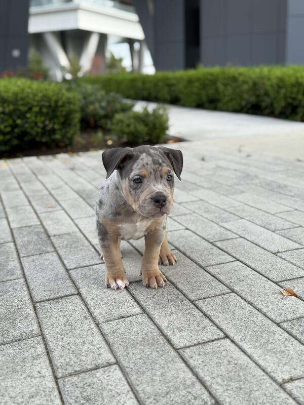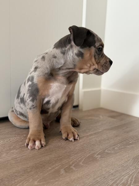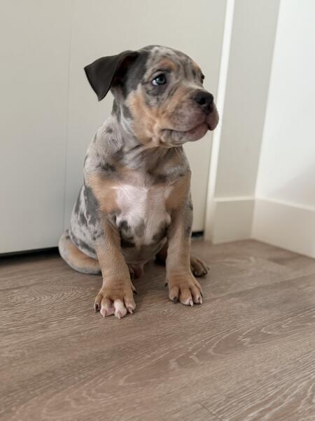 message stevenyvr about this ad 8-Week-Old Tri Merle American Pocket Bully Male Details: 8 weeks old First set of shots & deworming complete Started on pee-pad potty training (occasional accidents) Playful, high-energy, and very intelligent Compact build, beautiful merle pattern, and excellent markings This pup has a unique look and strong potential as either a family companion or future stud. Dont miss out on adding this rare Tri Merle male to your program or home. Serious inquiries only ready to go today! |
