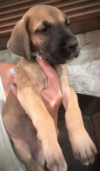 message mwaltz78 about this ad 60% Euro Fawn female Great Dane. Sire is an 85% Euro chocolate, he is 37 tall and weighs 180 pounds. Dam is a 30% Euro harlequin, she is 35 tall and weighs 150 pounds. Both parents have excellent temperaments. They are great with other dogs, people, and kids. |