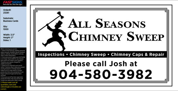 message productof77 about this ad All Seasons Chimney Sweep and Inspection also does dryer vent cleanings, solar panel cleanings, a/c duct cleanings and roof inspections. One or two story homes, condos or apartments. From metro Jacksonville to the beach locations. All inspection come with videos and pictures sent to your email. All gas fireplaces are tested for carbon monoxide for safety. Serving all of Jacksonville and Beach locations. Please feel free to call or text anytime. 904-580-3982, Josh Thank you, Josh |