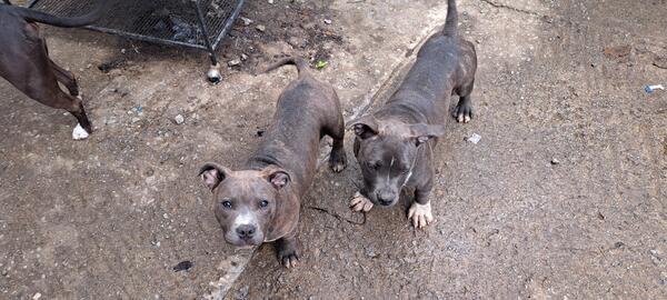 Born Jan 20, 2025. Both are blue/brindle mix. Not completely housetrained but we're working on it. Mom is on premises.