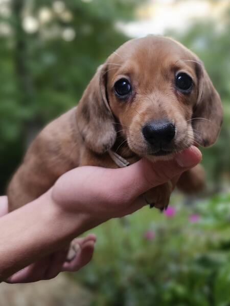 message cbleier423 about this ad Teal collar female is a dapple short haired miniature dachshund. She is so sweet and gets prettier everyday! She will come home with first set of shots, microchipped, dewormed every two weeks, pad trained and a goodie bag. She's ready to go home September 28th. |