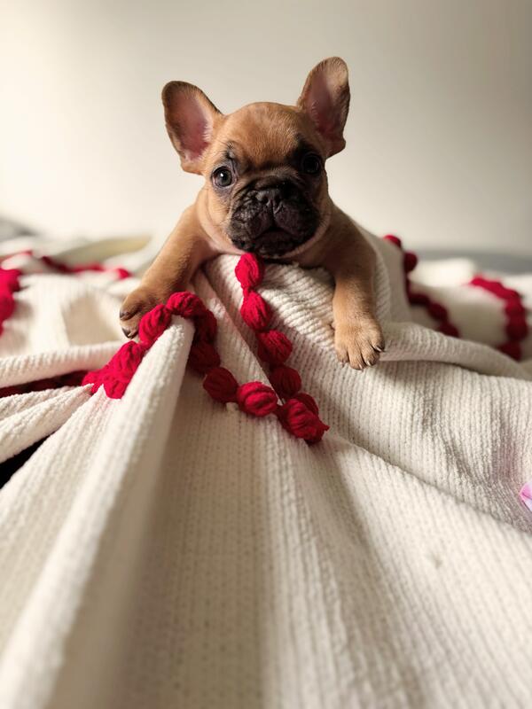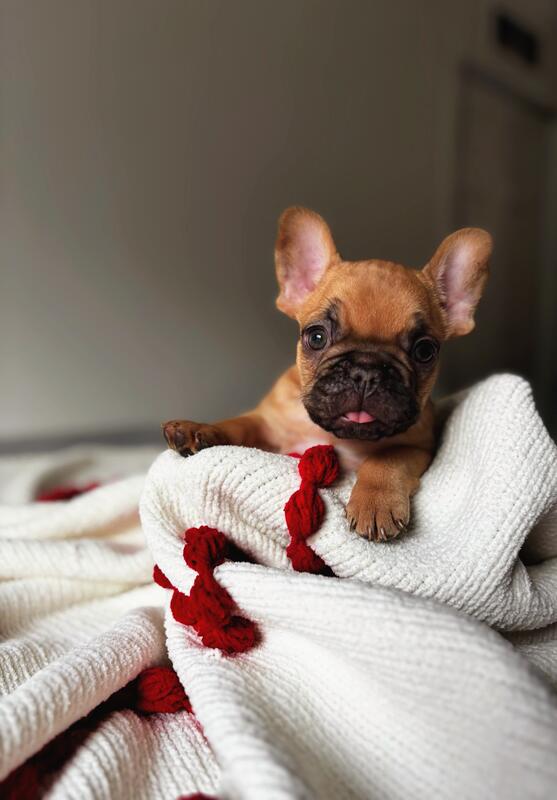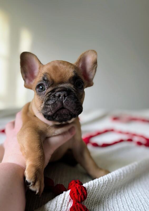 Male French bulldog puppy Red Fawn black mask. AKC parents health tested. Looking for pet home.