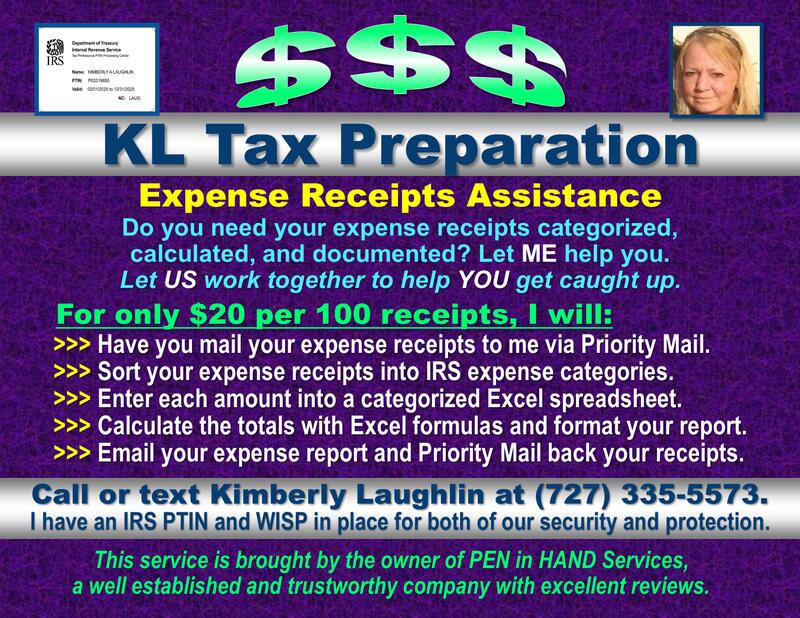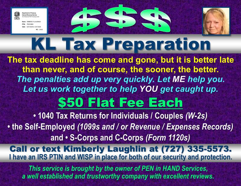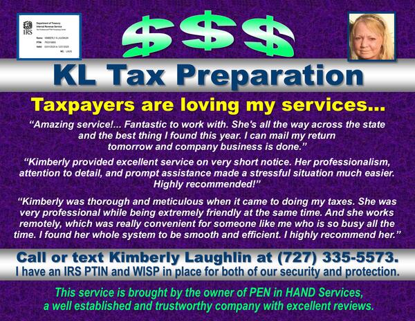 message kimlaughlin7 about this ad Affordable Tax Return Preparation - $50. The tax deadline has come and gone, but it is better late than never, and of course, the sooner, the better (2025 and earlier years included The penalties add up very quickly. Let ME help you. Let us work together to help YOU get caught up. Simple Tax Return Filing by KL Tax Preparation, a division of PEN in HAND Services, a well-established and trustworthy company, is operating remotely seven days a week from Saint Petersburg, FL. Here are my most recent reviews from tax clients (posted on my PEN in HAND Services Google profile Amazing service Fantastic to work with. She's all the way across the state and the best thing I found this year. I can mail my return tomorrow and company business is done. Kimberly provided excellent service on very short notice. Her professionalism, attention to detail, and prompt assistance made a stressful situation much easier. Highly recommended! Kimberly was thorough and meticulous when it came to doing my taxes. She was very professional while being extremely friendly at the same time. And she works remotely, which was really convenient for someone like me who is so busy all the time. I found her whole system to be smooth and efficient. I highly recommend her. I only charge a $50 Flat Fee for: 1040 Tax Returns for Individuals / Couples (W-2s) the Self-Employed (1099s and / or Revenue / Expenses Records) and S-Corps and C-Corps (Form 1120s all of which must be mailed in. In fact, I can prepare your previous years tax return for the same $50, but those also must be mailed in. I know that even with tax preparation software, many people either do not feel comfortable doing it themselves or they are just too busy. Let me do the work for you. I have a lifetime of experience preparing and filing taxes for myself and others. Remote Service via Phone Calls, Texts, and Emails Professional, Personable, and Friendly Service. Fast, Efficient, and Secure. I have: 1) an IRS PTIN (Preparer Tax Identification Number posted here, and 2) a WISP (Written Information Security Plan) in place for your security and protection, both of which are posted on my website. If you or someone you know could use my services, please message me, Kimberly, or text me at (727) 335-5573. We can then speak on the phone if you wish. I personally prefer phone consultations because, like most people, I like to be able to speak with a person one-on-one, but you will find me genuine, attentive, professional, and personable through any form of contact, which you will also find in my client reviews. If, for some reason, you call instead, PLEASE leave a voicemail so that I can reach back to you. My contact hours are 10 am to 7 pm EST Mon through Sun. message kimlaughlin7 about this ad |