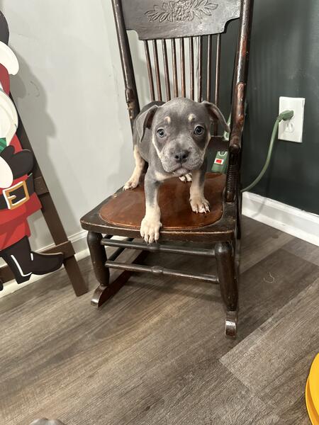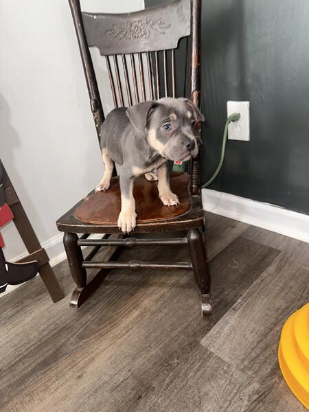 message inkman85 about this ad We have Athena we have a tri coat mix between a American bully and a French bull dog shes grey sliver with the tan cream and little hints of white at chest we have parents on sight mother and father great with kids the structure of these dogs should be around the mothers size we believe they will the a little bigger with more of the muscular build from father the 9 weeks old just had there first shots and there dewormed pictures of parents in the photo description contact cell 2674443281 name s g |