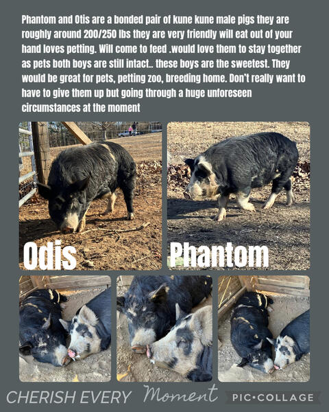 message preciousangels0306 about this ad Sally brown with black spots 16/18 months old duroc/ berkshire She is around 300/350 lbs Sue blackish grey and tan/white 14/16 months old berkshire / Hampshire She is around 200/ lbs. Both very friendly will let pet and eat out of your hand Update both just had piglets one litter was born Monday (memorial day) and the other born the following Wednesday (today) Both together for 400 or will trade for mini mare or mini Jenny or will trade for nanny Nigerian goats Phantom and Otis are a bonded pair of kune kune pigs they are roughly around 200/250 lbs they are very friendly will eat out of your hand loves petting. Will come to feed .would love them to stay together as pets both boys are still intact. For the pair 400.00 or best offer or will trade for a mini mare or mini Jenny. Or will trade for nanny Nigerian goats as well these boys are the sweetest. They would be great for pets, petting zoo, breeding home. Dont really want to have to give them up but going through a huge unforeseen circumstances at the moment We also have a litter of kune kune piglets that were born July 25,2025. That are ready to go. Only Two boys and two girls left super sweet babies 125.00 each or will trade for nanny goats as well message preciousangels0306 about this ad |