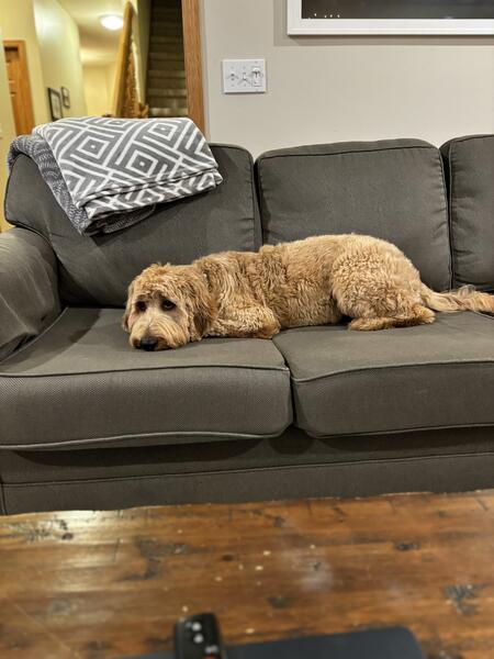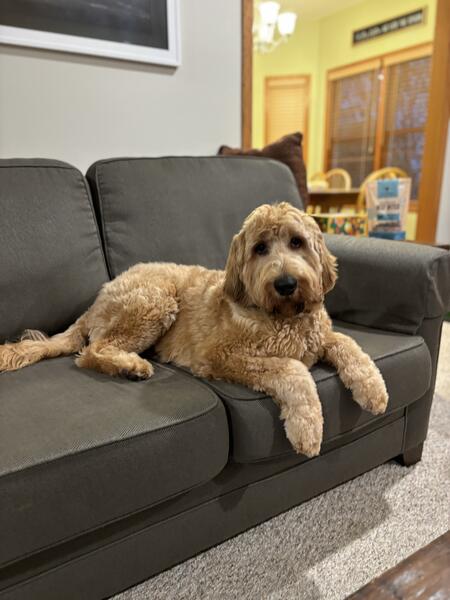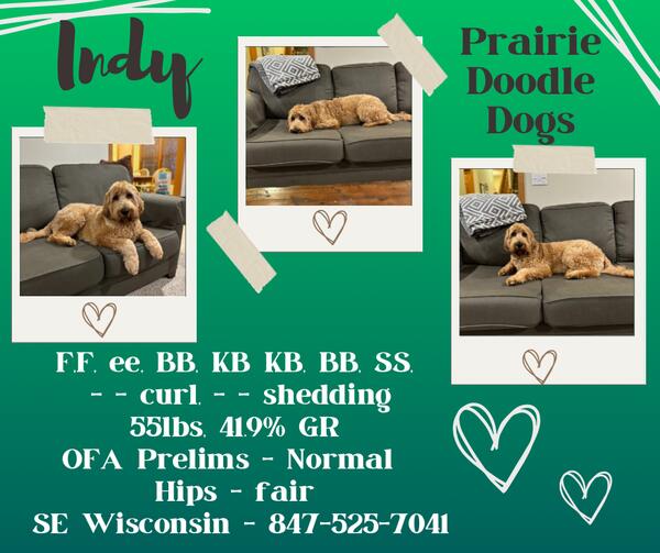 message elisabeth65 about this ad Indy is located in Southeastern Wisconsin. He has his CGC. . Indy has a laid back personality and hair that combs out easily. He has been tested through Embark and is not a carrier for any known diseases. OFA hips - prelims fair OFA heart, elbows, patella - prelims normal He is FF, ee, BB, SS, curl - shedding TT 22 inches 55 lbs 41.9% Golden Retriever 34.8% Standard Poodle 23.3% Small Poodle 847-525-7041 Reduced rate till hes proven. |