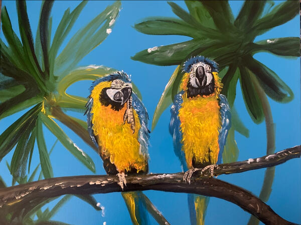 message peaceonearth about this ad Macaw After Rainstorm is real-life scene of a pair of wet macaws chilling together. Acrylic on stretched canvas. Not framed. Ready to hang. |