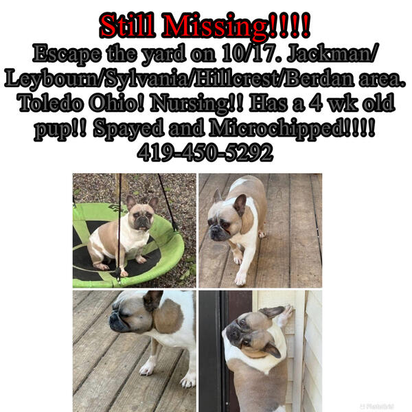 message mliss77 about this ad Mayhem went missing 10/17 Toledo Ohio area She has a puppy that is still nursing She is microchipped and spayed If seen please contact me at 419-450-5292 She is much loved and wanted hone |
