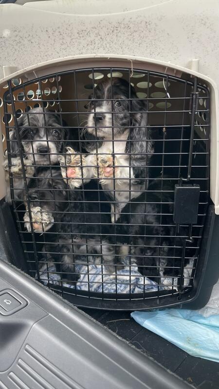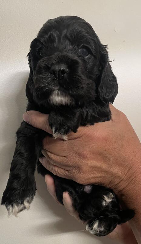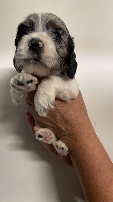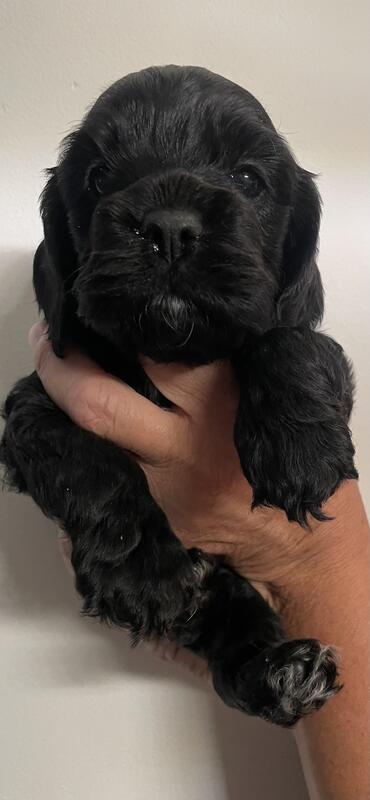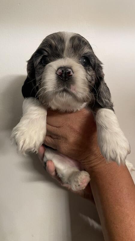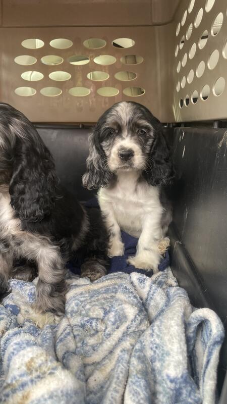 message winston009 about this ad 10 week old cocker spaniel puppies . 3 boys 2 girls. Boys- 2 black , 1 Merle with blue eyes. Girls- 1 black, 1 Merle. Parents in house. Wormed and 1st distemper shot. Natural tails. |