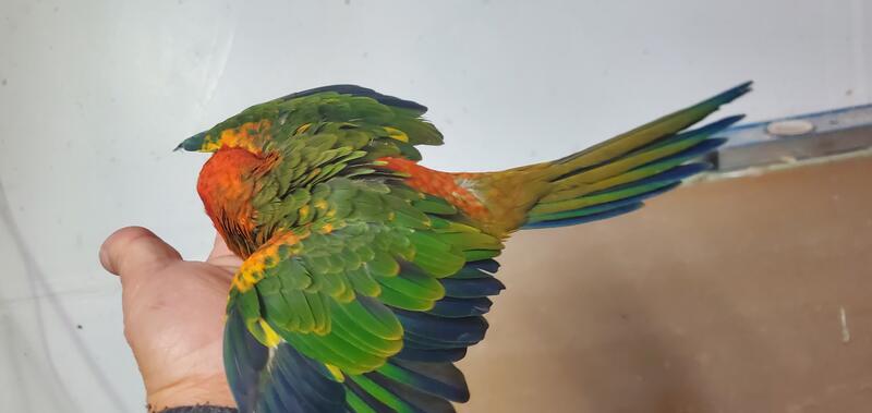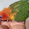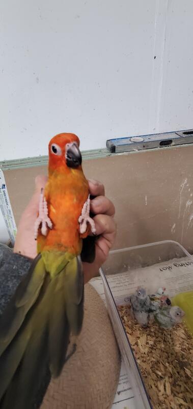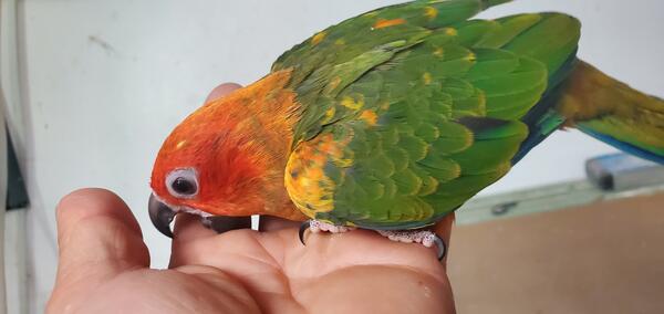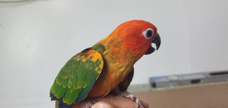 Weaned, tamed red factor sun conure baby