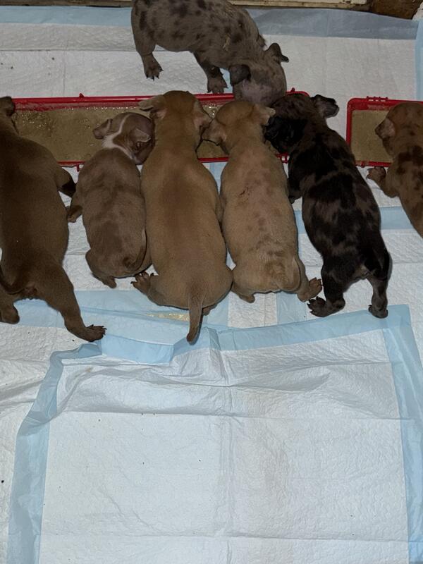 message trell23 about this ad 3 boys and 2girls left All come with papers and first shots / dewormed. All of them are Merle beside the one chocolate and white girl. Im willing to work with u on the prices long as its make since, they are already going for the low for great quality dogs. More pics coming soon |