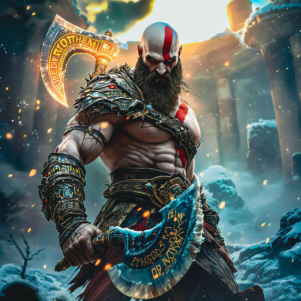 message aaryan about this ad ' : : "Unleash the fury of Kratos, the iconic God of War, in this stunning digital artwork. With his mighty Blades of Chaos at the ready, Kratos stands tall amidst a backdrop of ancient ruins and mystical energy. The intricate details and vibrant colors bring this Norse mythology-inspired scene to life. A must-have for fans of the God of War series and digital art enthusiasts alike. Perfect for decorating your gaming space or as a unique gift : :35% discount on first order. |