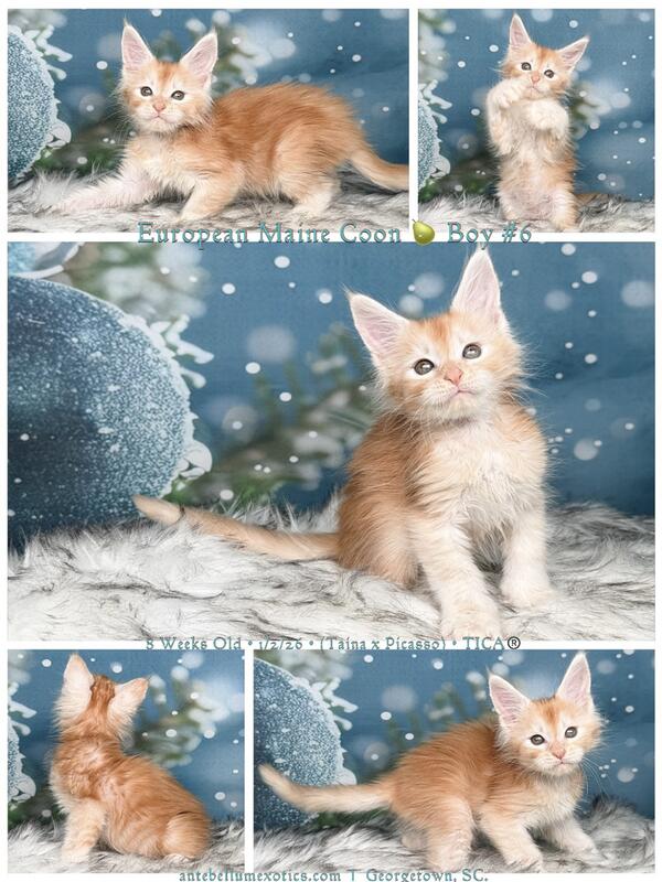 message antebellumexotics about this ad European Maine Coon Boy #6 - TICA (L' Pablo Picasso x Taina) Coat: Red Classic Tabby / White Nose: Pink 8 Weeks Old: 1/3/26 Date of Birth: 11/8/2025 Birth Time: 1:50 am Birth Weight: 138 g Now accepting reservations until he can go to his forever loving home. Please contact us directly to discuss him and adoption process. They will be ready for adventure after 12 weeks of age fully vetted with microchip, health guarantee, and lifetime breeder support. (See full list of what we include on our site) See him from birth to now on our website and find out more about this gorgeous breed and how they can be a part of your life. antebellumexotics.com | Georgetown, South Carolina |