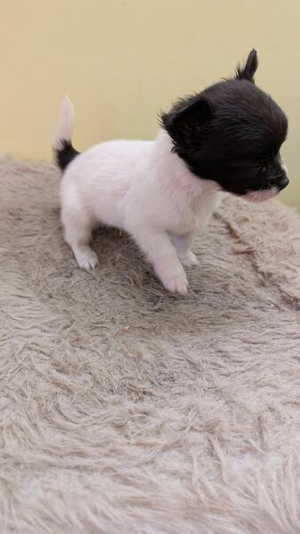 message chihuahua419 about this ad I have a male, black and white long-haired Chihuahua puppy He is mostly white with black head and a black spot back by his tail Very small, 8 weeks old His name is Snoopy He is up to date on shots and deworming He is ready for his new home |