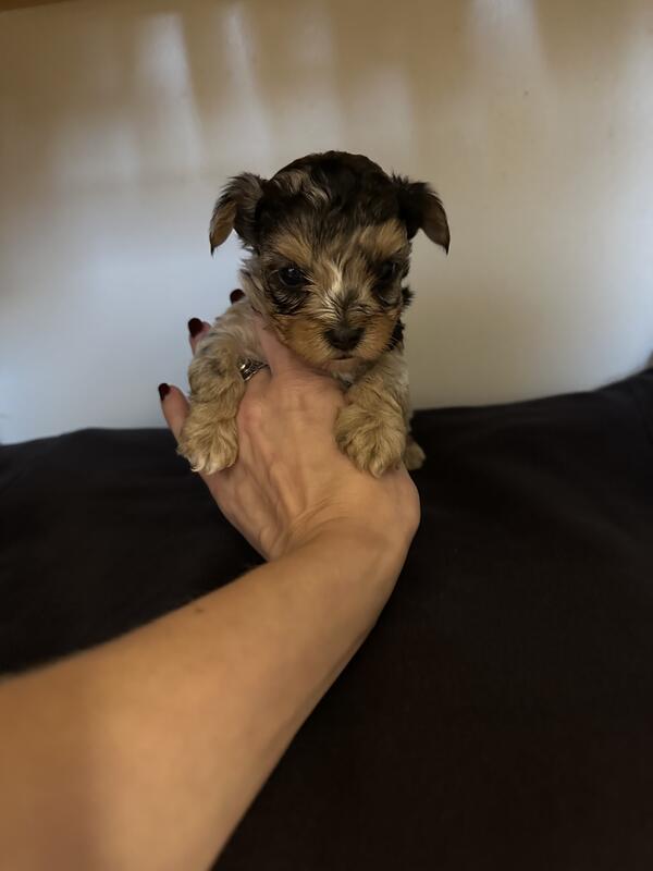 message froggirl321 about this ad We have 4 Morkie Poo puppies available and they will be ready for Christmas! A non refundable deposit of $300 is required to hold. Once a deposit is placed you will receive update pictures every two weeks until pick up. Mom and dad have both been health tested. Mom is a Morkie Poo and dad is an AKC traditional Parti Yorkie. Puppies come with a vet check, up to date on vaccines, dewormed and are microchipped. Theyre socialized with my children, cats, and other dogs. Will be used to everyday noises such as the vacuum which limits anxiety. Blonde female- $1000.00 Traditional Parti male- $1000.00 Chocolate Parti female(tiny $1500.00 Blue Merle male (solid blue eye $2500.00 Please, SERIOUS INQUIRIES ONLY. Text 3134673425 |