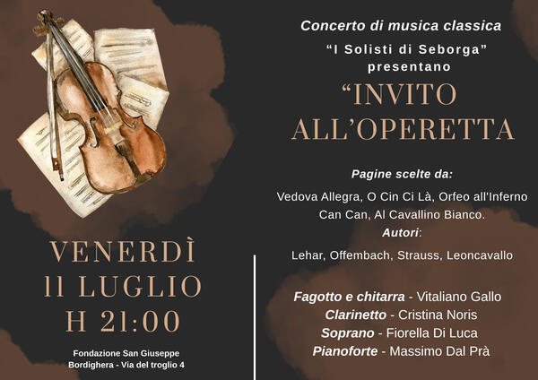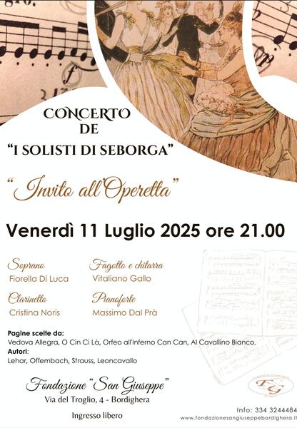 message vitalianogallo33 about this ad Venerd 11 Luglio 0re 21,oo Bordighera Alta IM Fondazione S. Giuseppe via del Troglio 4 concerto Invito all'Operetta I Solisti di Seborga dirige il M* Vitaliano Gallo la Riviera Ligure ha nella storia accumulato tanto prestigio essendo conosciuta sin dal Rinascimento come zona dal clima eccezionalmente mite e salubre. Uno dei borghi pi celebri Bordighera, che dal 1800 ad oggi meta di turisti da tutto il mondo, in particolare dal Nord Europa tutto l'anno dovuto al clima particolarmente favorevole e salubre anche nei mesi invernali. Fu il romanzo "Il Dottor Antonio, scritto in lingua inglese nel 1855 dallesule italiano G. Ruffini, a stimolare lattrazione per la citt di Bordighera. La citt offre tanti servizi, tra cui la Fondazione San Giuseppe che risale al 1896 con la presenza delle Piccole Suore della Sacra Famiglia inviate dal loro fondatore, Beato Giuseppe Nascimbeni, su richiesta dell'amico don Luigi Cordioli allora parroco del paese di S. Martino B.A. che mise a loro disposizione un edificio donato alla Parrocchia. E' proprio in questa Fondazione che Venerd 11 Luglio alle 21h avr luogo un concerto dedicato all 'Operetta dei solisti di Seborga diretti da Vitaliano Gallo al fagotto, Fiorella Di Luca soprano, Cristina Noris clarinetto, Massimo Dal Pr pianoforte. Musiche di Lehar, Offembach, Strauss, Leoncavallo. Ingresso Libero prossimo appuntamento 16 Luglio Fanghetto IM Omaggio a Luciano Pavarotti & Friends nel 90 info: orchestraprincipatodiseborga com message vitalianogallo33 about this ad |