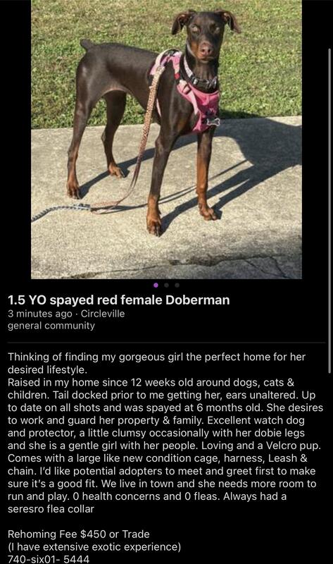 message moonlitmarsupials about this ad Thinking of finding my gorgeous girl the perfect home for her desired lifestyle. Raised in my home since 12 weeks old around dogs, cats & children. Tail docked prior to me getting her, ears unaltered. Up to date on all shots and was spayed at 6 months old. She desires to work and guard her property & family. Excellent watch dog and protector, a little clumsy occasionally with her dobie legs and she is a gentle girl with her people. Loving and a Velcro pup. Comes with a large like new condition cage, harness, Leash & chain. Id like potential adopters to meet and greet first to make sure its a good fit. We live in town and she needs more room to run and play. 0 health concerns and 0 fleas. Always had a seresro flea collar 0 dog warden issues & never had any accidents. Rehoming Fee $450 or Trade (I have extensive exotic experience and prefer someone with large guard dog experience for her best chance at a wonderful life) I will be choosy on who she goes to because she is my angel and I love her I dont want to rehome her but shes very active and deserves more than a city life. 740-six01- 5444 message moonlitmarsupials about this ad |