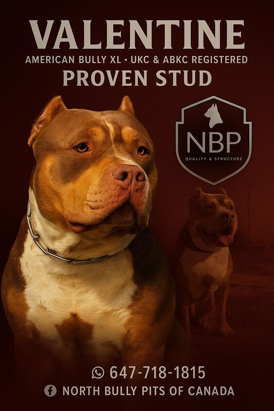 message northbullypits about this ad UKC/ABKC VALENTINE Proven Stud Class: XL Weight: 120lbs Colour: Chocolate Tan and White Sire: Bossys Big Pun Dam: Bossys Chanel |