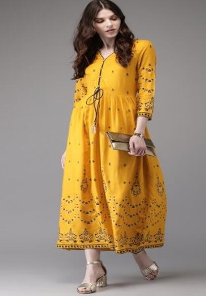 message prerana about this ad Product Code: 9186557 Yellow and Navy Blue printed anarkali kurta, has a V-neck, three-quarter sleeves, and flared hem The model (height 5'8 is wearing a size S Look and feel beautiful in this uniquely designed kurta from Anouk. Dress up for your next family event by pairing this yellow piece with your best Kolhapuris and simple jewellery. 100% viscose rayon Machine-wash httpsmyntr.it/Z27J36m |