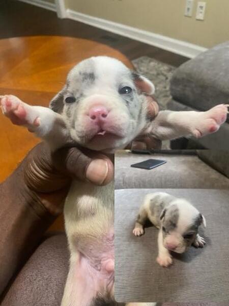message mnnfrshye about this ad Merle Bullies and carries with great definition and structure 6 weeks old,4 males left 3 Merle and 1 Blue ABKC Registered, for more pictures and Info Please contact 7707553872, $1500 and up |