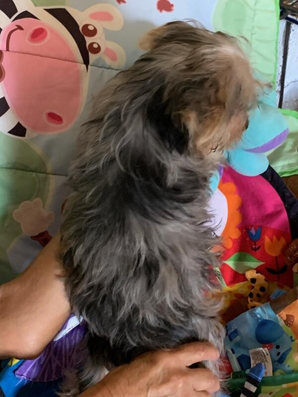 message marialuisa about this ad Small, Energetic, And he is intelligent Pup! His color has Merle distinctives color! His coat is Silky Fluffy, Beautiful Disposition, Love's Attention, Loves Attention he is Small, Tail Dock, De-claw remove, Parents are Purebred Yorkie Terrier's, He plays well with other pups/dogs! He is Very Playful! The Picture's were taken up close he is *Alot Smaller, Cuter in Person |