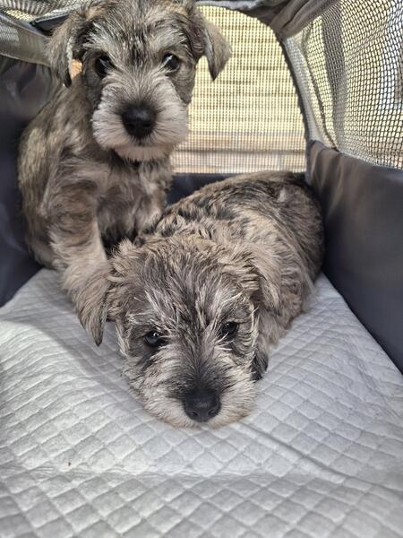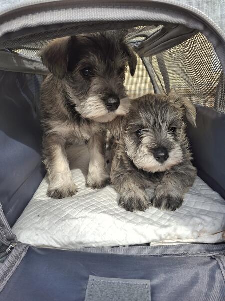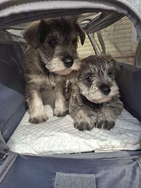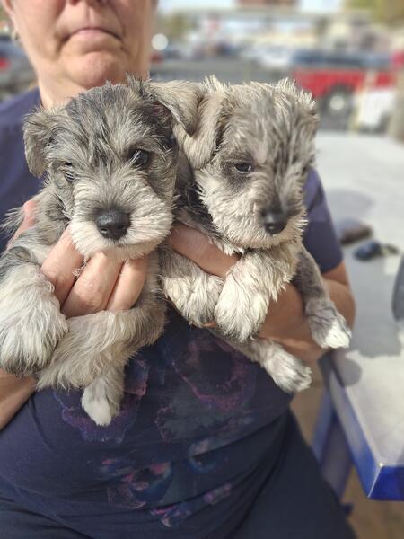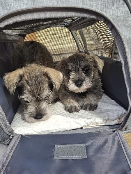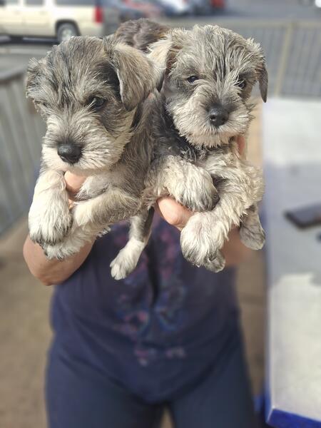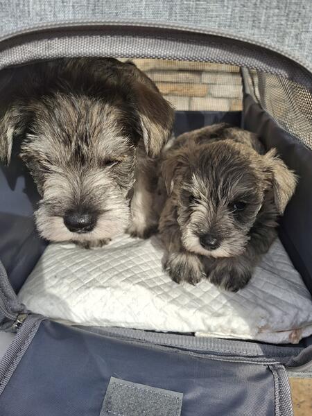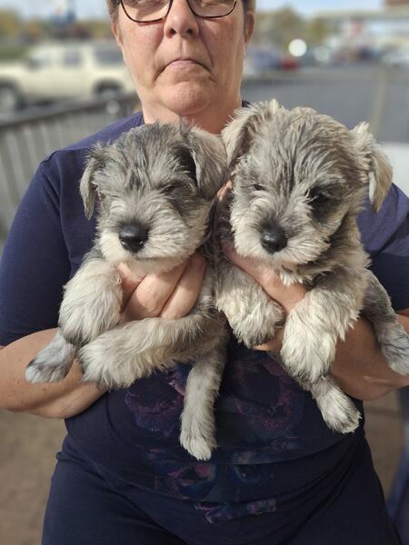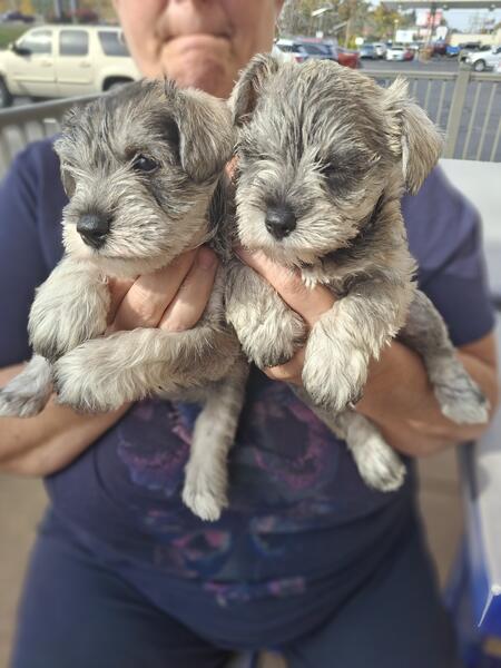 message shnbr3511 about this ad Min Schnauzer pups. They will be 7 weeks old Nov 5th. They have their first shots,wormed, tails and dewclaws removed . Theyre eating Purina one puppy. P.O.P they will go home with a leash and harness and a pop-up play pin |