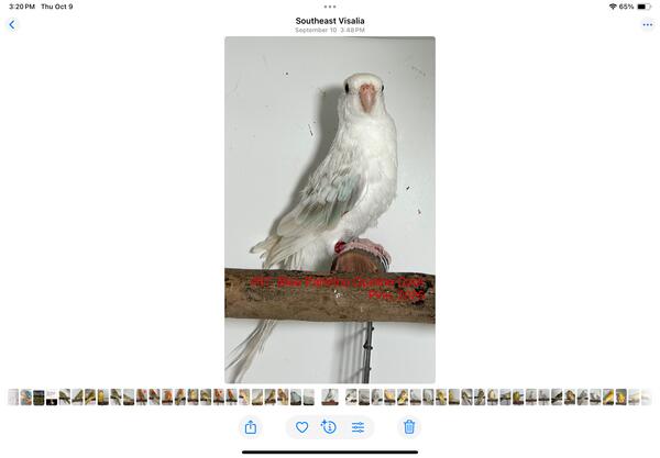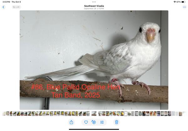 message albertkonder about this ad This cock is a Blue Pallidino Opaline, Single Factor Dominant Pied. The hen is a Blue Pallidino Opaline. Raised outdoors on a varied diet of seed, veggies, pellets, veggies, mealworms and eggs, this pair is molting into their adult plumage and will be ready to work in 2026. Will ship, weather permitting. |