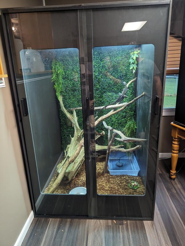 message cspvg1563 about this ad 2.5 year old male sailfin dragon. Not hand tame, but has never shown any type of aggression. Eating well on greens, fruits, veggies, and live insects. The enclosure is full black PVC, custom, solid glass doors, 4'x4'x6 2 heat lamps (with shields a large UVB bulb in the center, and an air pump for bubbles in the water. The tank can be split in half for easier transport (2'x4'x6 and easily seals back up with silicone. Just looking to downsize houses. Any questions, feel free to contact me! |