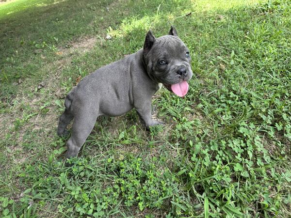 message tdskn8007 about this ad I have a solid blue micro bully female and another solid blue with white stripe on her head, 12 weeks old, they will be about 10-12in tall and 40-50 pounds. Good pedigree they are ABR registered, up to date on shots and dewormed. $1500 for pet home/ puppy back or $2500 with full breeding rights. 256-801-5613 |