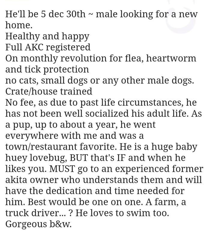 message jennaflii about this ad He'll be 5 dec 30th ~ male looking for a new home. Healthy and happy read entire ad, thanks On monthly revolution for flea, heartworm and tick protection no cats, small dogs or any other male dogs. Crate/house trained No fee, as due to past life circumstances, he has not been well socialized his adult life. As a pup, up to about a year, he went everywhere with me and was a town/restaurant favorite. He is a huge baby huey lovebug, BUT that's IF and when he likes you. MUST go to an experienced former akita owner who understands them and will have the dedication and time needed for him. Best would be one on one. A farm, a truck driver ? He loves to swim too. Gorgeous b&w. Thank you all! He is a beautiful akita |