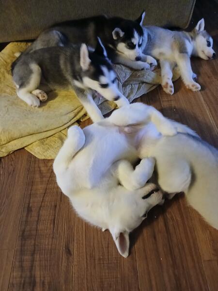 message sckhcm6602 about this ad We currently have 5 adorable puppies. Born September 21st. 4 females (2 dark, 1 light and 1 gray 1 white male. Parents picture also attached (and on premises They are purebred. If you are wanting a Siberian Husky with blue eyes, they are a MUST SEE! They are so loving and playful! They have had their first shots and vet checked (with health records They are ready now for their forever homes. Females $350 Male $300 Please call or text Robert at 513 608-4881 for more information |