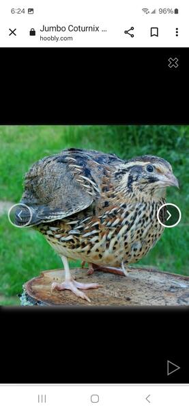 message vinnyvinn947923 about this ad jumbo coturnix quail females 7.00 Eggs $3.00 a doz (meat birds $2.50 each. my cell 609-455-3687 ( Breeder set 5 femals 1 male. $35.00 |