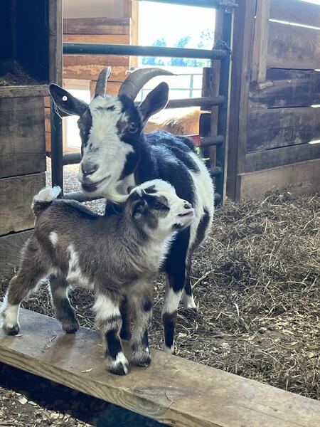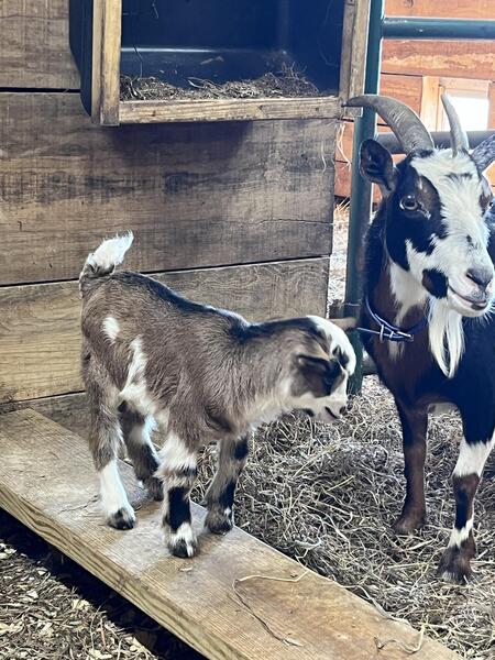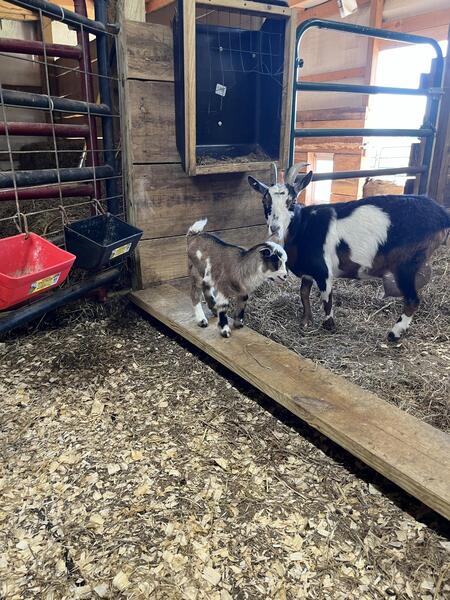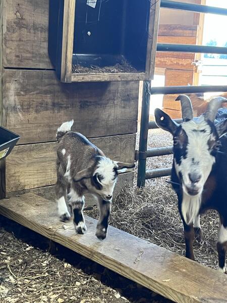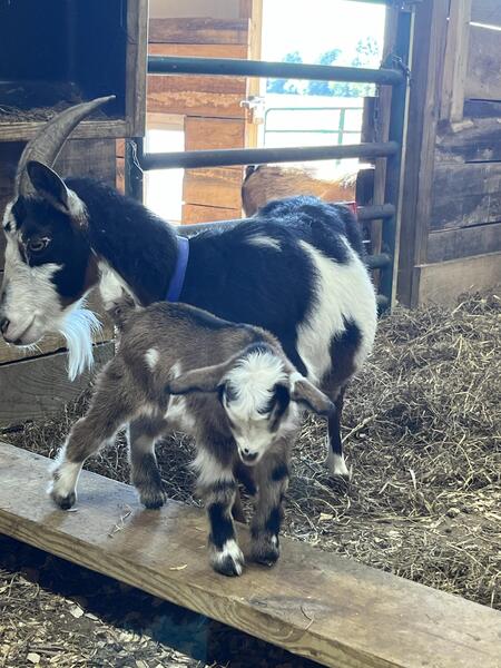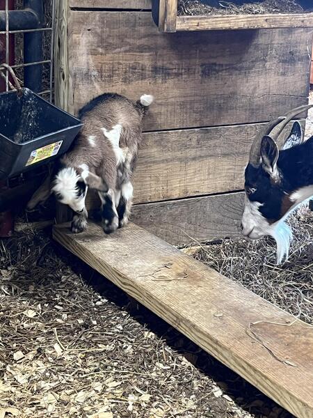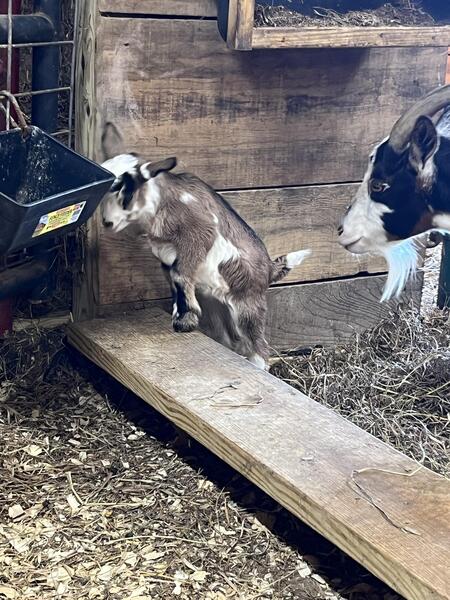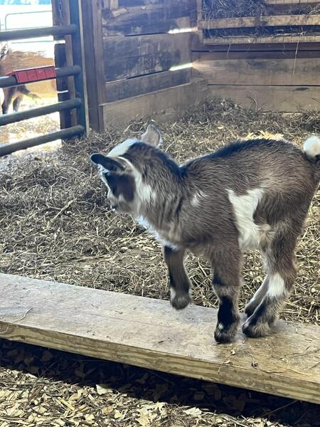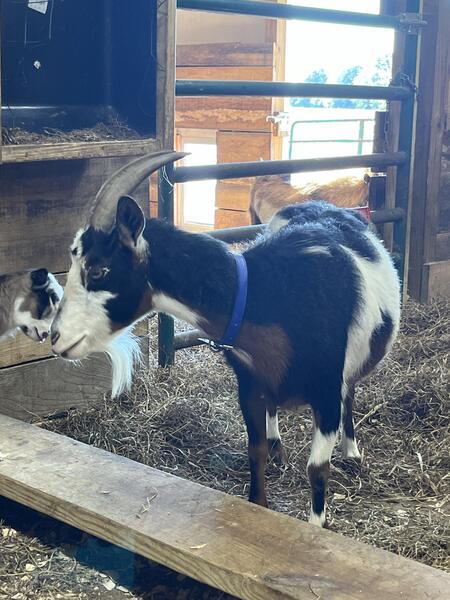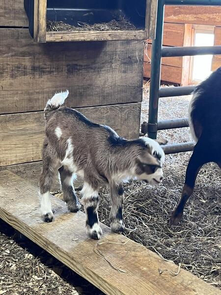 Fainting doe born May 17th. Raised by dam. Pasture every day. Shots, disbudded, wormed. Available July 12th.