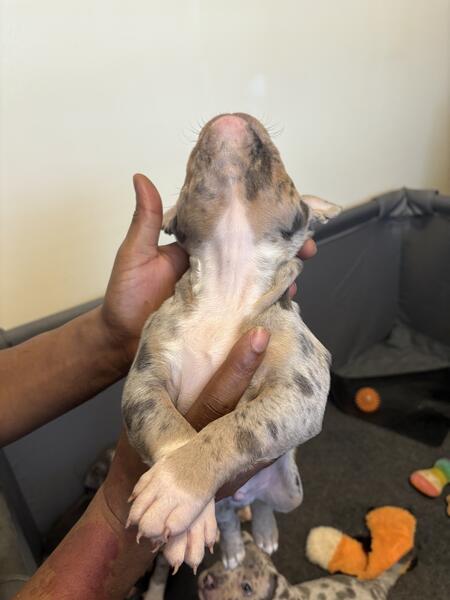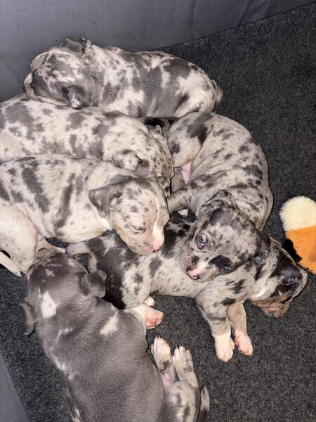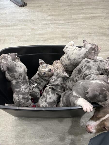 message m7jackson about this ad Ash is a pocket bully, he a blue Merle tri, he has excellent structure & temperament, call for anymore info. 750, no pup back For a limited time. Ill continue to add pups that hes produced as the litters drop, but as u can see he throws blue Merles & blue Merle tris! The litter u see he was bred to a brown and white female 810-333-0181 Call for details |