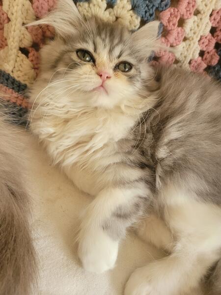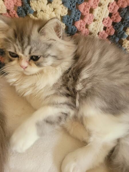 message dreamweavercattery about this ad Silver Shaded and White bicolor Boy, 1st shots, wormer, bath flea meds. Ready to go to his fur-ever home. Plays, loves, purrs n follows you everywhere, wants everything your eating even when he gets his food. Loves to play, nap, cuddle and snack on rainy or snowy days. Nice cuddle buddy. If you need updated pics or videos please text 1-989-385-2822 as Hoobly doesn't let me send those through this messenger system and I will gladly send you updated pics n videos.I try to meet people half way around Michigan n close States. Thank you n Good Bless. His Mom is Silver Shaded his Dad is Blue n White bicolor tuxedo Persian. Kitten has dad's pugger nose, mom's Silver Shaded n white patches from Dad. Little cutie. |