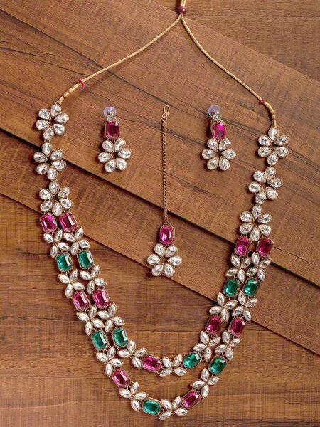 message pritee about this ad Product Highlights Share Deals Get Orders from Friends & Family Earn Money Transfer to Bank Earn Upto 8.5% Profit on all Myntra Transactions Profit will track within 1 hour from the time of transaction Profit will get confirmed within 80 days of transaction Product Code: 11715398 This jewellery set consists of a layered necklace, a pair of earrings and maang tikka Gold-plated, Pink and Green artificial stone-studded layered necklace, secured with an adjustable drawstring fastening A pair of matching drop earrings, secured with a post-and-back Comes with matching maang tikka Necklace Length: 27 cms Earring Length: 5 cms Maangtikka Length: 13 cms Flaunt your distinct style statement by wearing this necklace, earring & maang tikka set from The House Of Zaveri Pearls. This Jewellery can be used for multiple events like Festivals, Mehendi, Haldi, Sangeet, Engagement, Wedding, Reception, Baby Shower, Party Or Fashion Shows. Material: Alloy Plating: Gold-plated Stones: Artificial Stones Care Instructions Wipe your jewellery with a soft cloth after every use Always store your jewellery in a flat box to avoid accidental scratches Keep sprays and perfumes away from your jewellery Do not soak your jewellery in water Clean your jewellery using a soft brush, dipped in jewellery cleaning solution only httpsmyntr.it/xoejiEp message pritee about this ad |