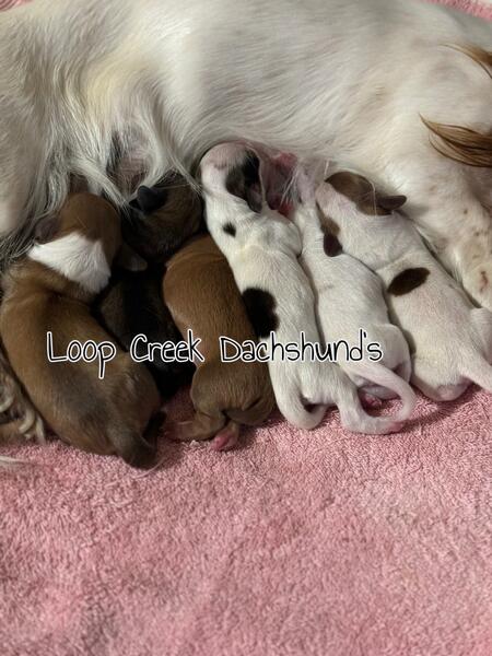 message doxiemomma about this ad New litters were born at Loop Creek Dachshunds in Fayetteville, WV. Litter pictured is MoonPie/Lennoxs Born 9/7/24. 3 boys and 3 girls All puppies are Shaded Red or Shaded Cream Piebald Longhairs. Price range on this litter is 1,800-2,200 pet only. We have 2 other litters plus expecting 1 more longhair Cream Brindle litter around 9/15/24. For quicker communication please visit our Facebook Business Page Loop Creek Dachshunds. My prices will vary depending on the litter, color:pattern, gender, and coat. Price range in most litters will be 1,800-2,200 pet only. Parents are AKC registered but if purchased as pet only you will not receive AKC paperwork. AKC registration papers will only be given to those that are granted and purchased FULL AKC rights (breeding rights A copy of parents pedigree will be sent home as evidence of kennel club registry |